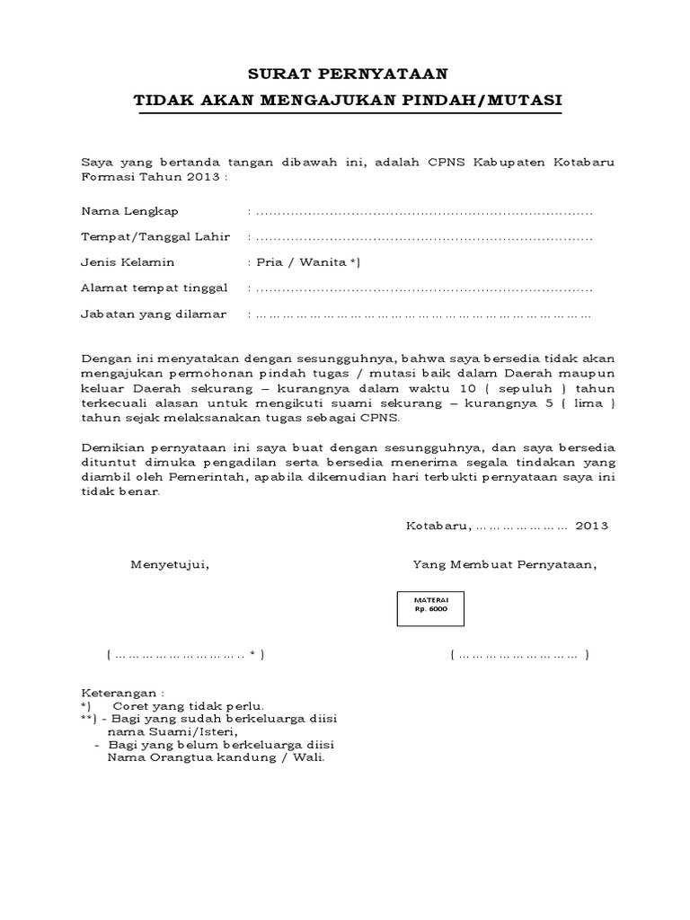 Semoga format doc (word) yang dilampirkan di atas dapat membantu kamu semua. Surat pernyataan bersedia ditempatkan dimana saja. Sebab, surat pernyataan belum menikah ini akan disertai materai dan berkekuatan hukum. Surat pernyataan ini digunakan saat seseorang diminta untuk tidak menikah selama bertugas. Surat pernyataan dibutuhkan dalam melamar. Surat pernyataan adalah surat tertulis untuk menyatakan kesanggupan, kesediaan, kesepakatan, atau hal lain yang berkaitan dengan hal tertentu. Ada contoh surat pernyataan kerja, contoh surat pernyataan kesanggupan, contoh surat pernyataan belum menikah, dan contoh surat pernyataan diri. Surat pernyataan belum menikah ini tidak bisa dianggap remeh meski mudah membuatnya. Surat ini dapat dipergunakan dalam berbagai keadaan sebagian besar sebagai. Menyatakan secara sadar dan iklas, bahwa saya belum menikah dan bersedia untuk tidak menikah selama masih mengikuti program pemuda sarjana penggerak pembangunan desa (psppd) di desa. Yang bertanda tangan di bawah ini bersama dengan surat pernyataan ini saya menyatakan bahwa saya merasa tidak keberatan jika anak kami. Surat pernyataan dapat bersifat resmi atau pribadi. Surat pernyataan belum menikah adalah salah satu surat keterangan yang menyatakan bahwa seseorang belum menikah atau berstatus masih single.